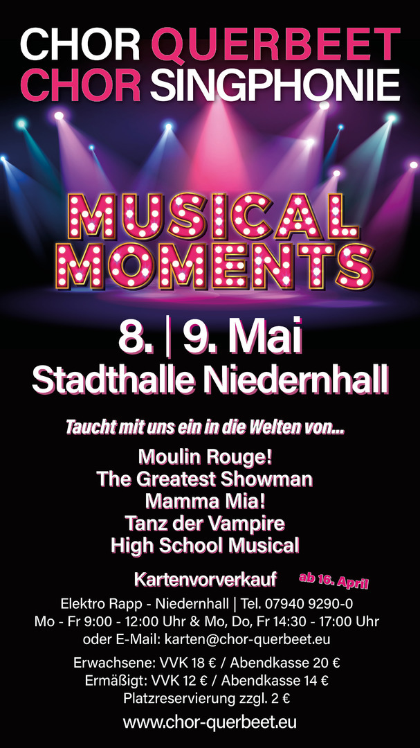 Wir sind ein Chor von jungen und jung gebliebenen Menschen, die sich jeden Dienstag abend in Niedernhall treffen. In den letzten Jahren haben wir neben vielen Konzerten zwei komplett eigene Musicals mit tollem Erfolg auf die Bühne gebracht. Aktuell ist das dritte in Planung.